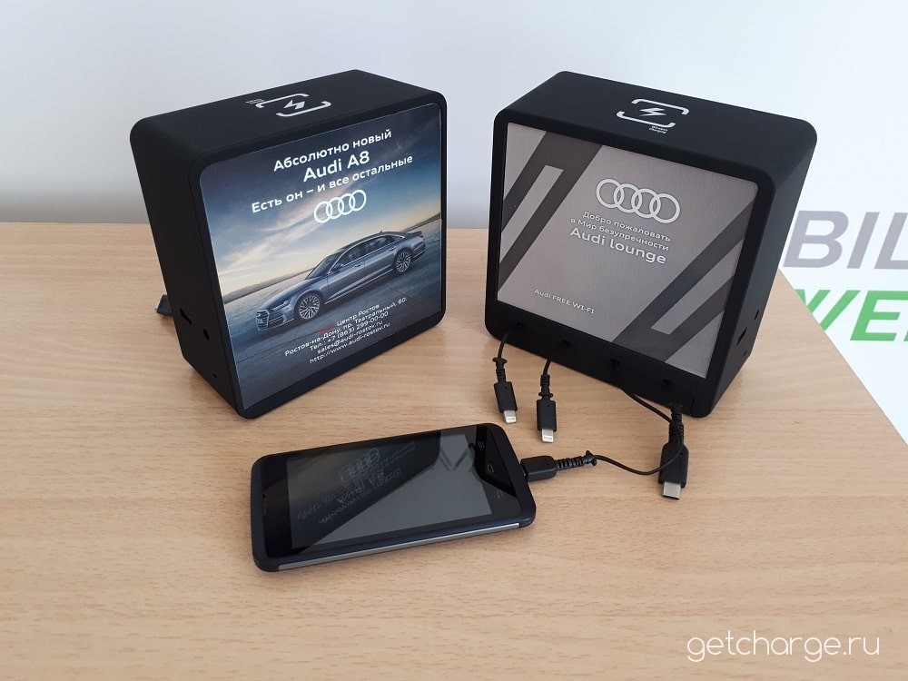 Устройства, созданные для эксплуатации в сегменте HoReCa, но быстро получившее признание и в других отраслях бизнеса. Зарядки оснащены мощными аккумуляторами для работы без розетки. Для продвижения продуктов и услуг зарядные устройства оснащены тейбл тентом для листовки либо HD экраном для трансляции фото/видео контента.