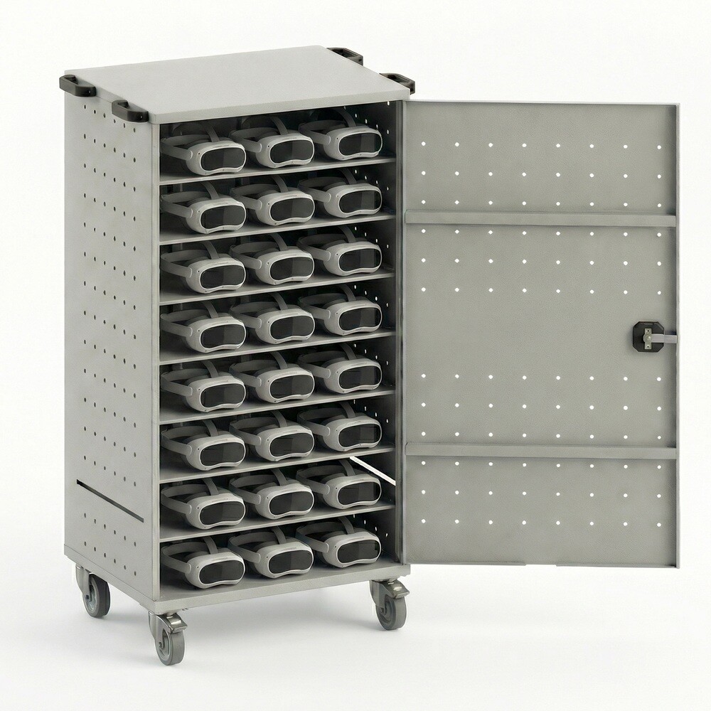 Назначение: Для одновременной зарядки и хранения до 24 VR шлемов в компьютерных клубах или образовательных учреждениях с VR уроками. Можно использовать, как стационарный шкаф или передвижную тележку для зарядки.