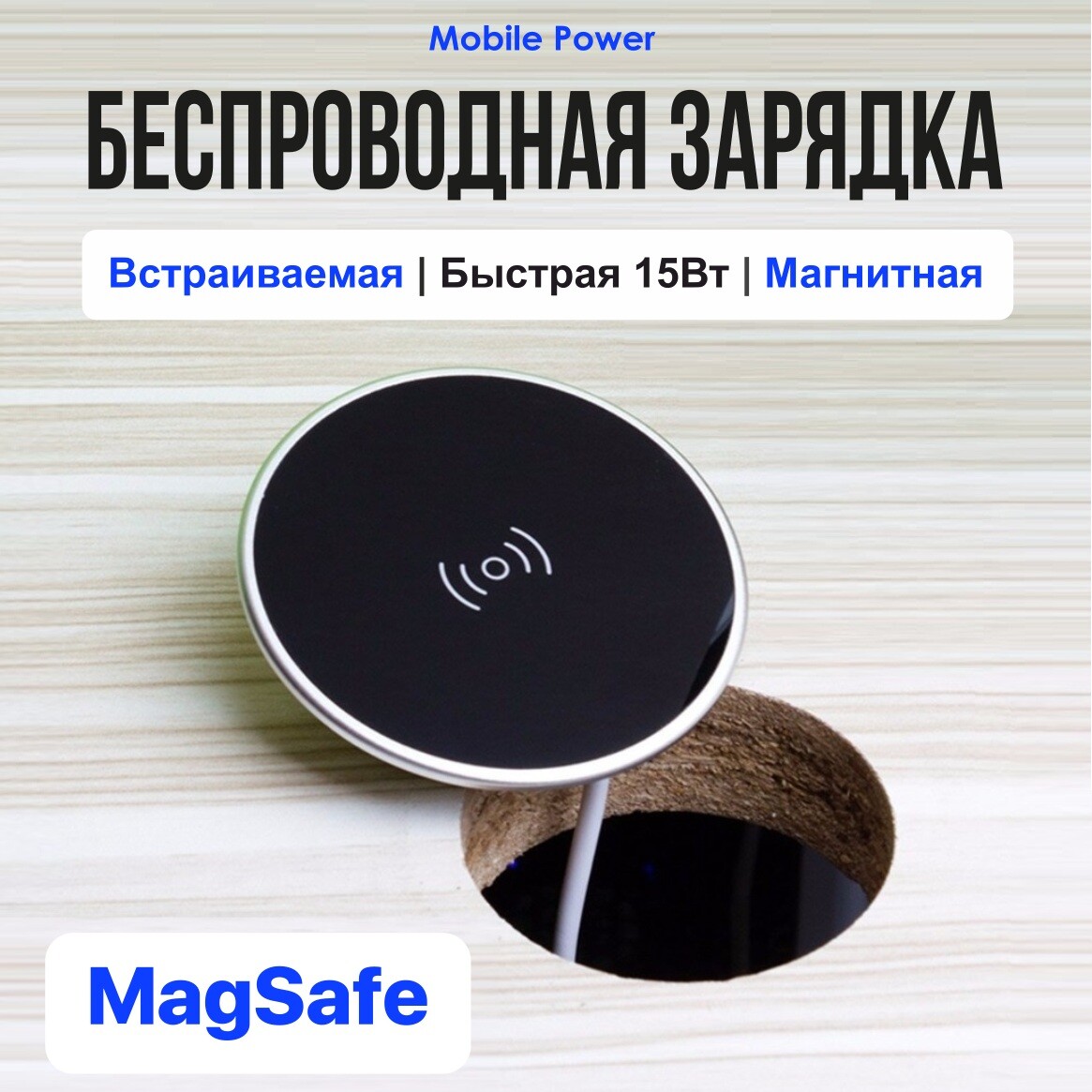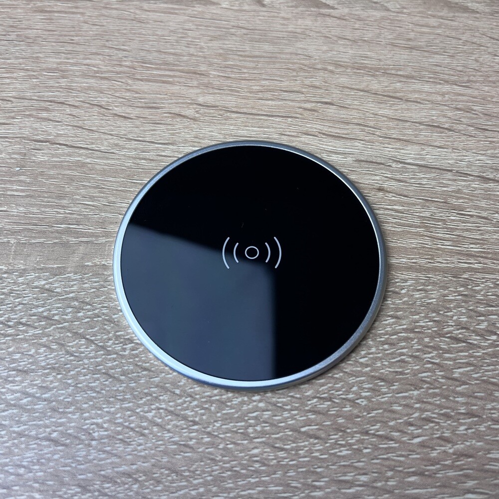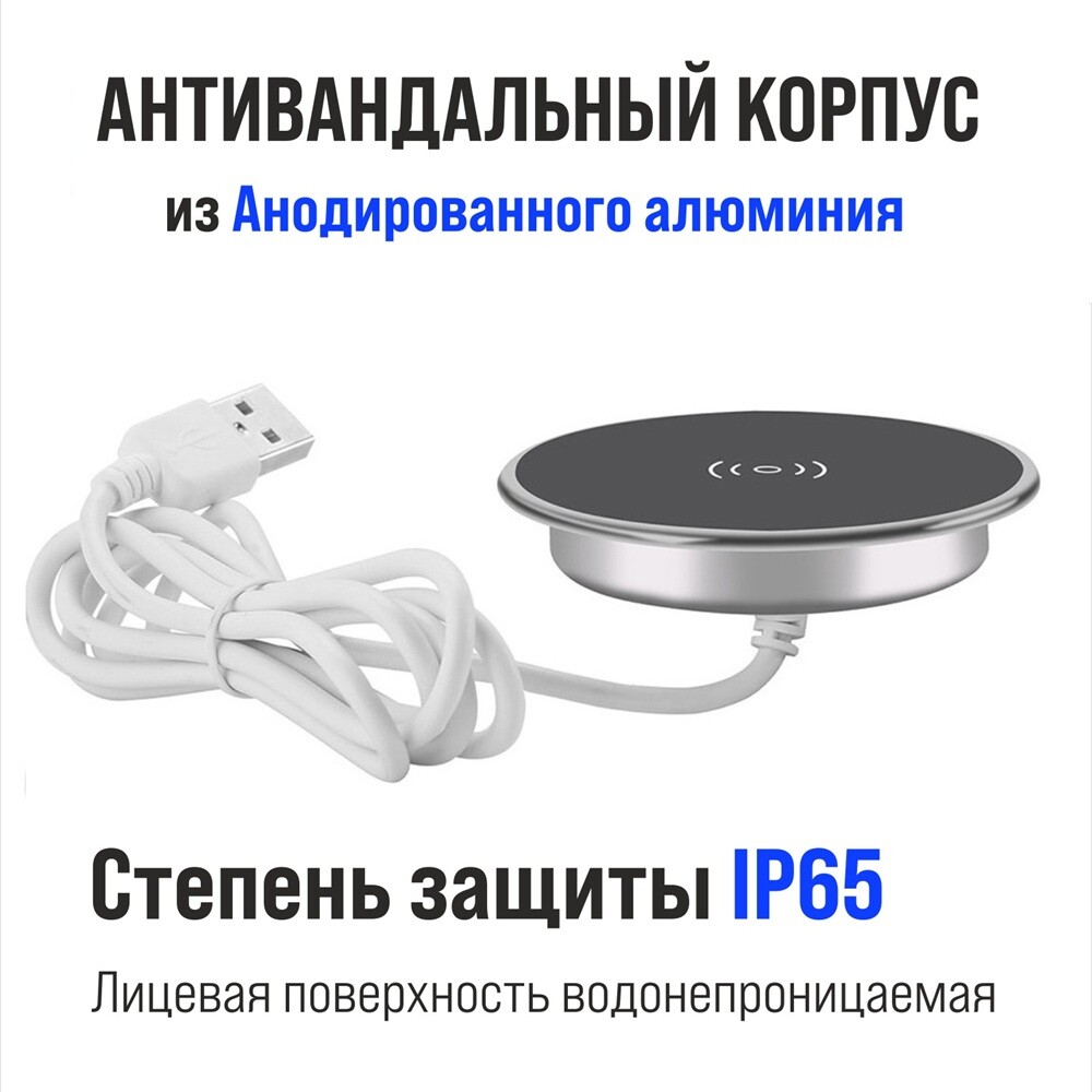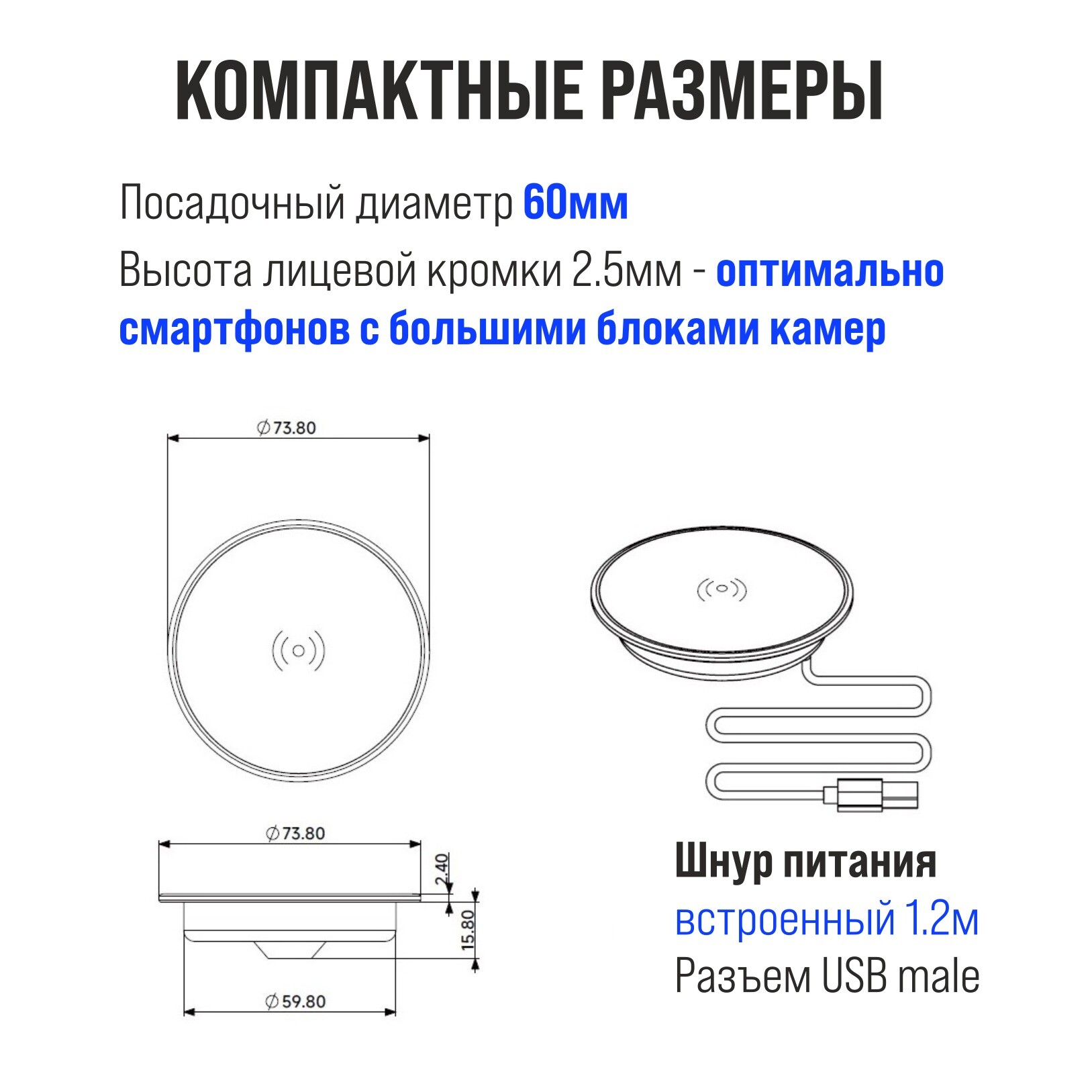 Беспроводное зарядное устройство Mobile Power t7m создано для установки в мебель, монтируется в круглое отверстие d60мм. Строгий лаконичный дизайн, матово-черная поверхность с хромированной кромкой. Металлический корпус с резьбой по центре. Отверстие в столешнице снизу закрывается стальной пластиной и притягивается болтом. Процесс установки простой и удобный, не нужно использовать клей. Лицевая поверхность водонепроницаемая. Т7m подходит для установки в мебель для общественных мест (столы в ресторанах, барные стойки, тумбочки в отелях, переговорные комнаты и пр.) Пролили на нее кофе - не страшно, на работу зарядки это не повлияет!