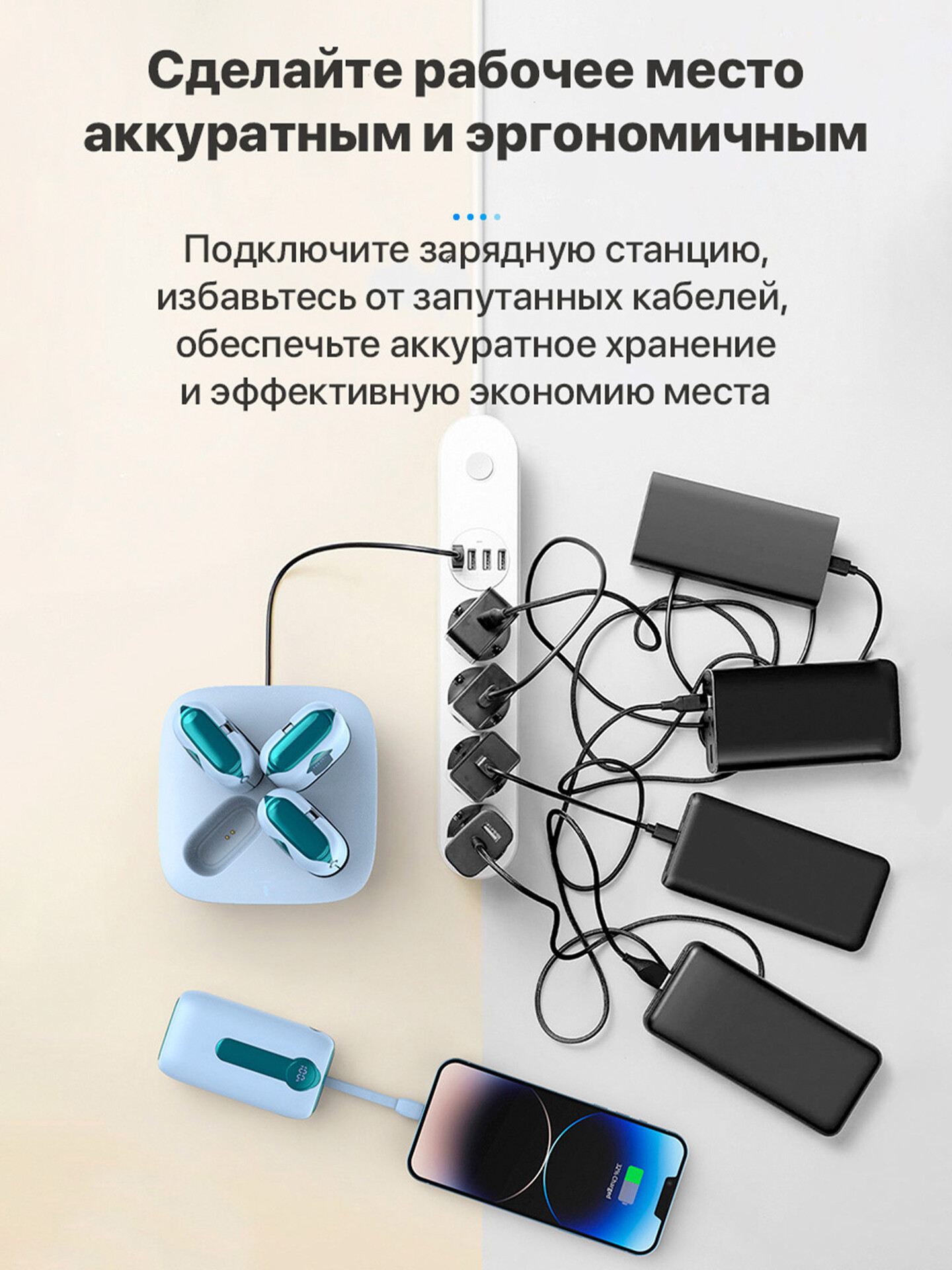 Знакомо? Так бывает, когда вы заряжаете одновременно несколько обычных повербанков - спутанные провода, куча занятых розеток, перегревающиеся адаптеры. Все это плодит пыль, грязь и беспорядок.
