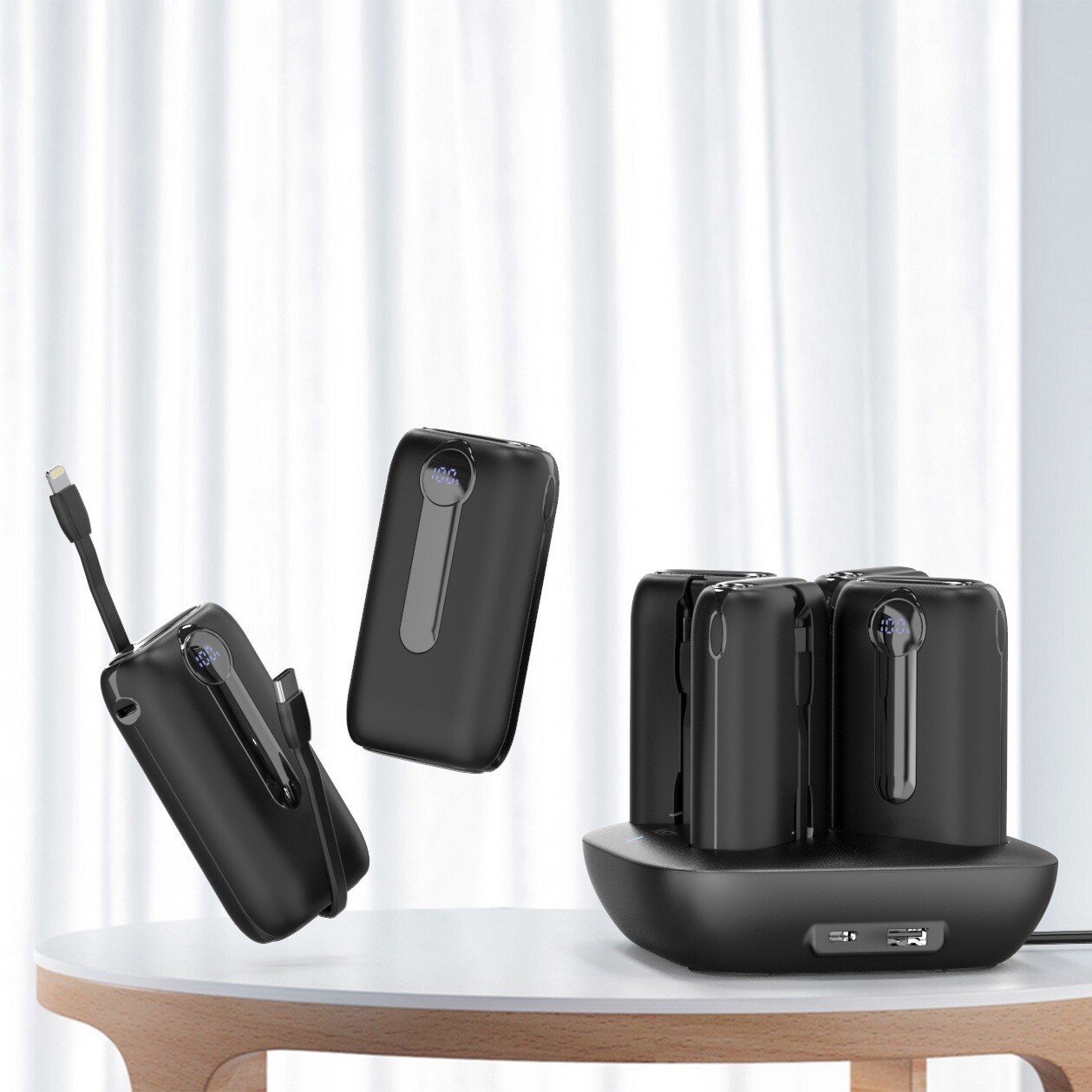 Зарядная станция с набором из 4 х 10000мАч повербанк. Все банки устанавливаются на док станцию, которая заряжает их быстро, одновременно и без проводов. Просто, удобно и комфортно для вас. Каждый power bank оснащен прочными встроенными проводами Type C и Lightning, которые поддерживают быструю зарядку PD 20 Ватт. При необходимости можно использовать свой зарядный кабель Type C, для этого на корпусе есть быстрый порт USB-C 20W. Каждый повербанк оснащен цифровым индикатором статуса зарядка батареи.