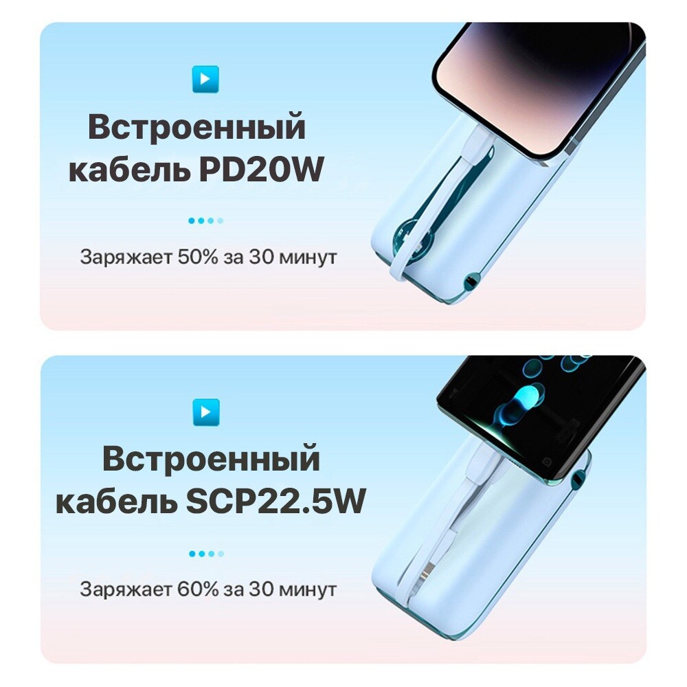 Два кабели с разъемами Type C и Lightning c функцией быстрой зарядки, поддерживают протоколы быстрой зарядки большинства самых востребованных производителей мобильных устройств - Apple, Huawei, Samsung, Xiaomi и пр. Дополнительно на каждом повербанке предусмотрен порт USB-C для подключения внешних кабелей