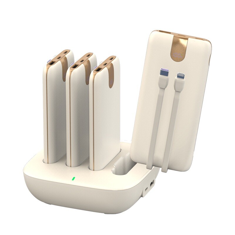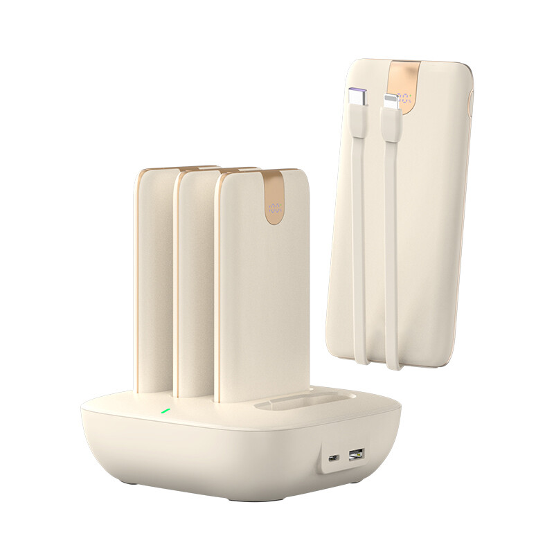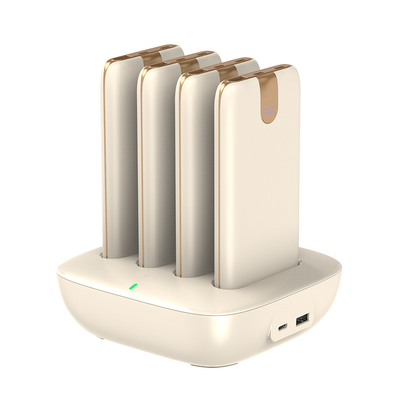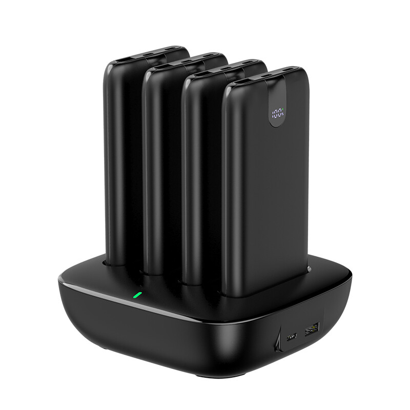 WST WP0264 - портативная зарядная станция с набором из 4 х 10000мАч повербанк. Внешние аккумуляторы устанавливаются на док станцию, которая заряжает их быстро, одновременно и без проводов. Просто, удобно и комфортно для вас. Каждый power bank оснащен прочными встроенными проводами Type C и Lightning, которые поддерживают быструю зарядку PD 20 Ватт. При необходимости можно использовать свой зарядный кабель, для этого на корпусе есть быстрые порты USB-C 20W и USB-A SCP 22.5W. Каждый повербанк оснащен цифровым индикатором статуса зарядка батареи.