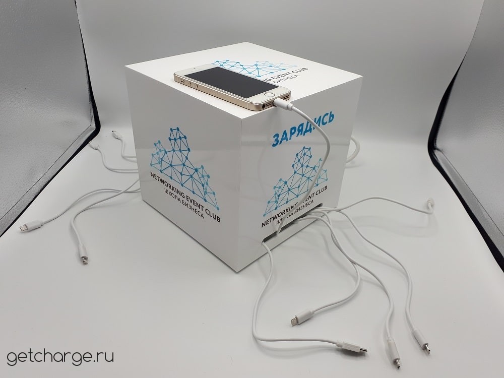 Краткая справка по оборудованию: Настольная зарядная станция кубической формы, питание от сети 220В, 10 встроенных кабелей. Дополнительно станция может быть оснащена беспроводными зарядками. Возможно изготовление станций индивидуального размера.