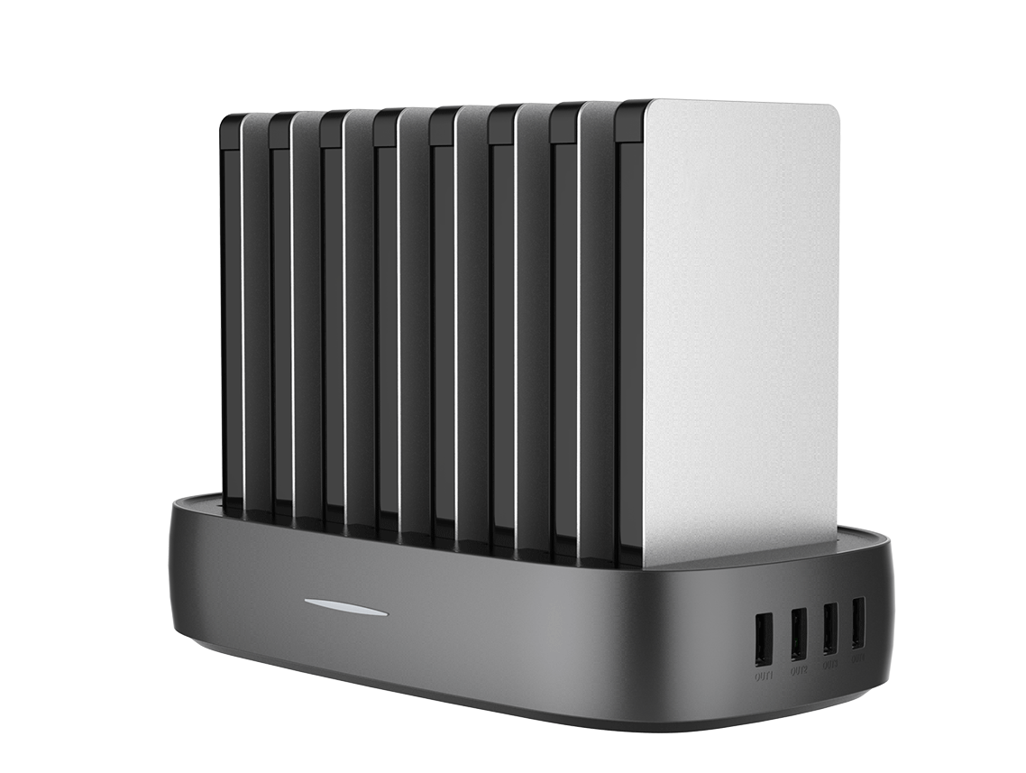 Краткая справка по оборудованию: 8 портативных зарядок емкостью 4000 мАч. Каждый power bank оснащен 2 встроенными кабелями. Аккумуляторы с магнитными контактами можно зарядить только от станции. Цвета: черный и белый.