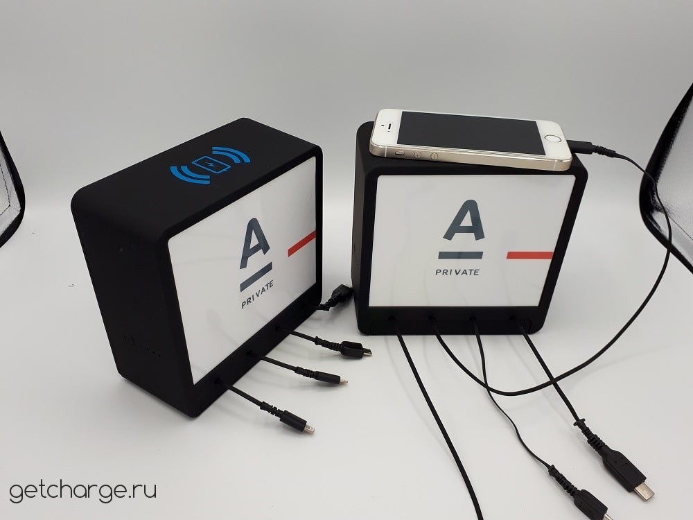 Краткая справка по оборудованию: 8 портативных зарядок емкостью 4000 мАч. Каждый power bank оснащен 2 встроенными кабелями. Аккумуляторы с магнитными контактами можно зарядить только от станции. Доступны цвета: черный и белый.